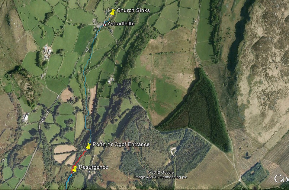| Map showing the river course from Ystradfellte, through Porth Yr Ogof and downstream |