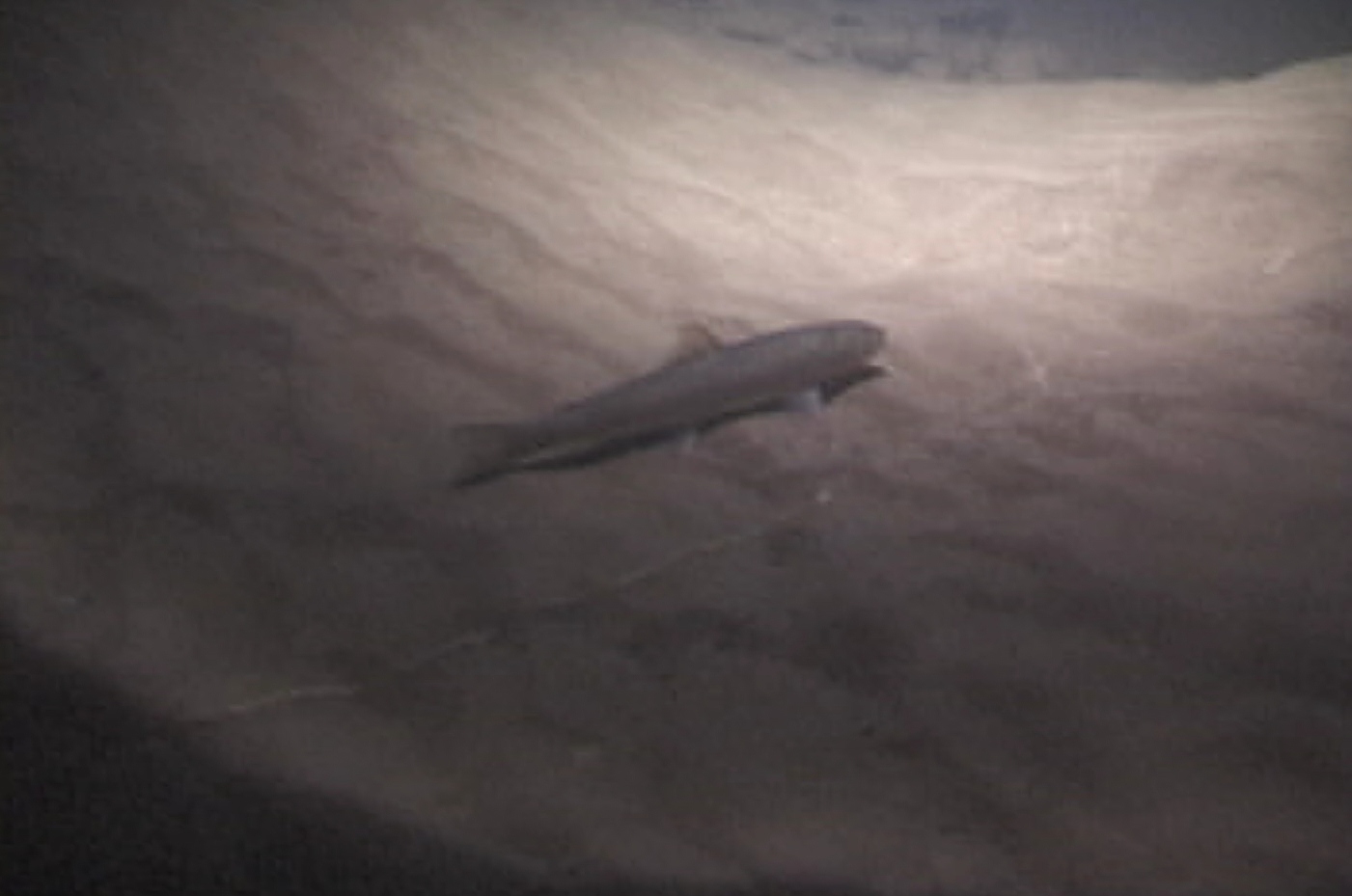 Tradesman's underwater fauna: 1 pigmented trout near entrance. 1 albino trout seen "just past right hand elbow". NO trout observed with mixed colouring.